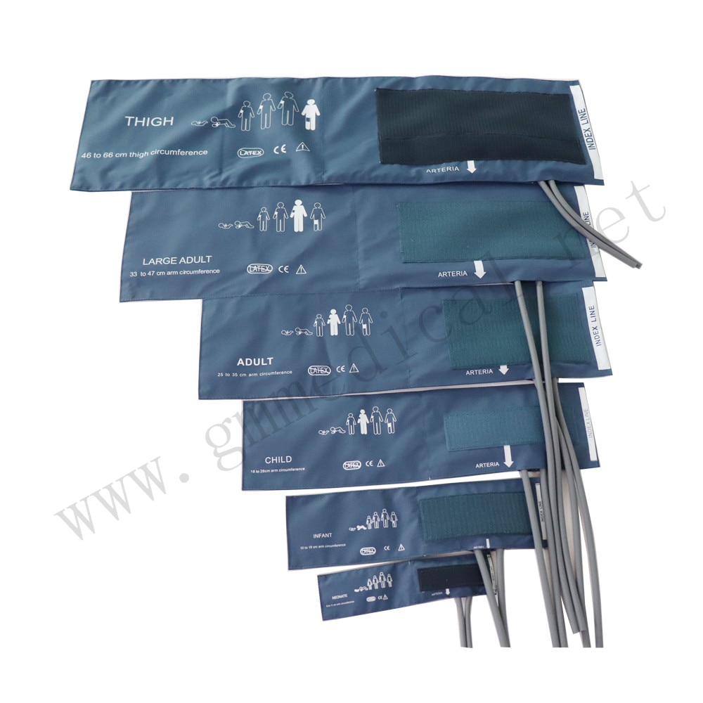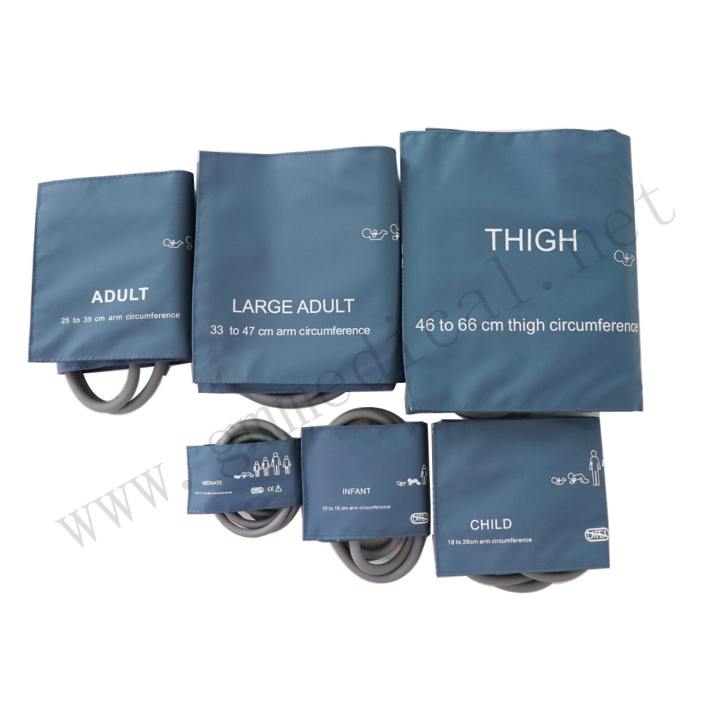 Matériel : Cuir pu Taille: CF001F-B:Neonate Soft Dual tube NIBP manchette , 6-11cm Circonférence du bras , Bleu CF002F-B : Manchette douce de double tube de bébé NIBP, circonférence de bras de 10-19cm, bleu CF003F- B :Enfant doux Double tube NIBP manchette , 18-26cm Circonférence du bras , Bleu CF004F- B: Adulte soft Dual tube NIBP manchette , 25-35cm Arm Circonférence , Bleu CF004LF-B :Grand adulte soft Dual Tube Nibp Cuff, 33-47cm Arm Circonference,Blue CF004TF-B :THIGH soft Dual tube NIBP Cuff,46-66cm Arm Circonference , Bleu