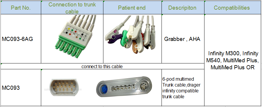 Compatible avec Draeger Infinity M300 ECG Leadwire - MS16547 6-POD ECG leadwire set