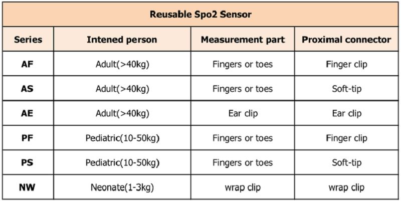 (Série PF et PS) Le capteur spo2 réutilisable est fabriqué en liaison avec l’oxymètre de pouls compatible pour une surveillance continue et non invasive de la saturation en oxygène fonctionnel de l’hémoglobine artérielle (SpO2) et de la fréquence du pouls (PR) chez les patients pédiatriques pesant 10 à 50 kg.